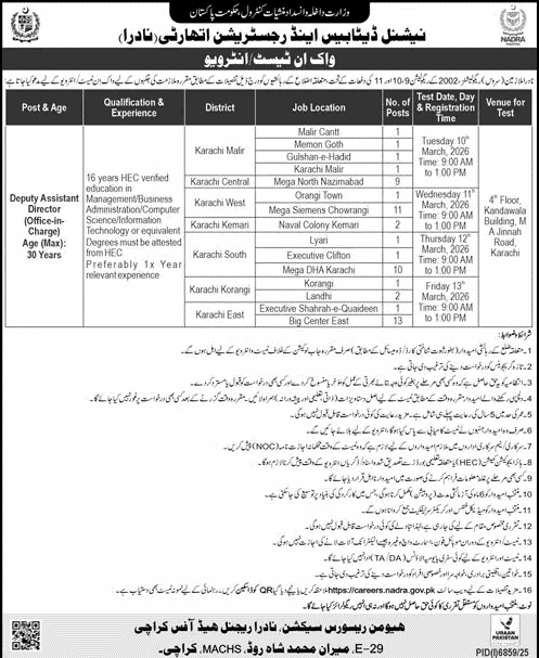 Deputy Assistant Director NADRA Karachi 2026 February Apply Online Office Incharge Walk in Test / Interview
